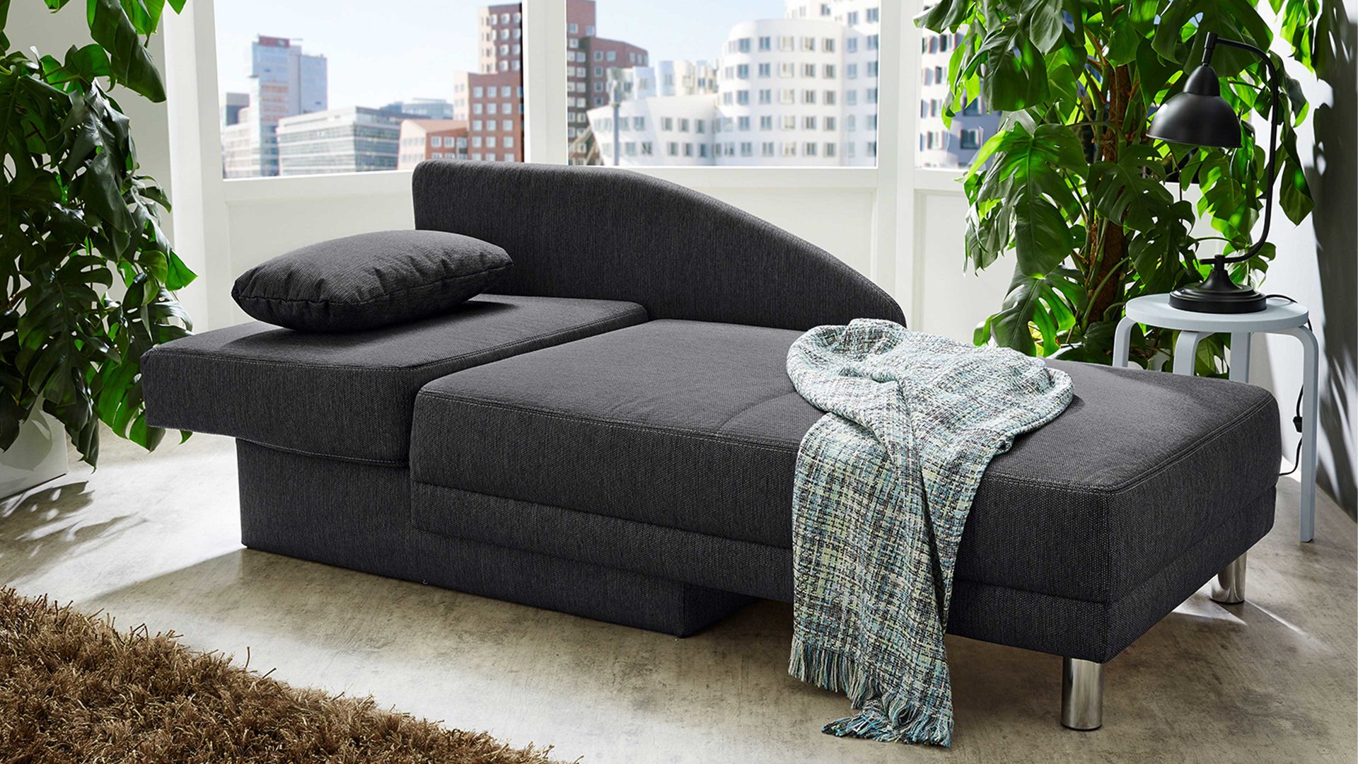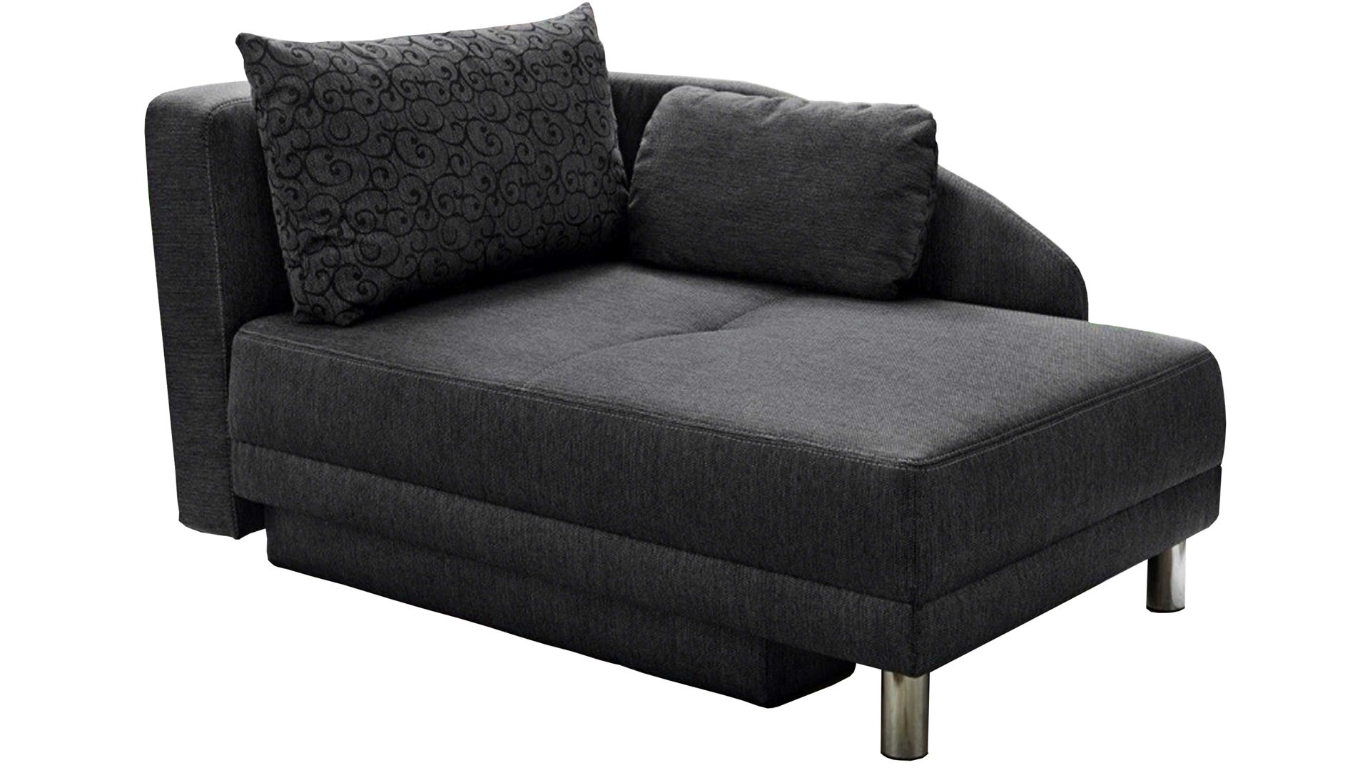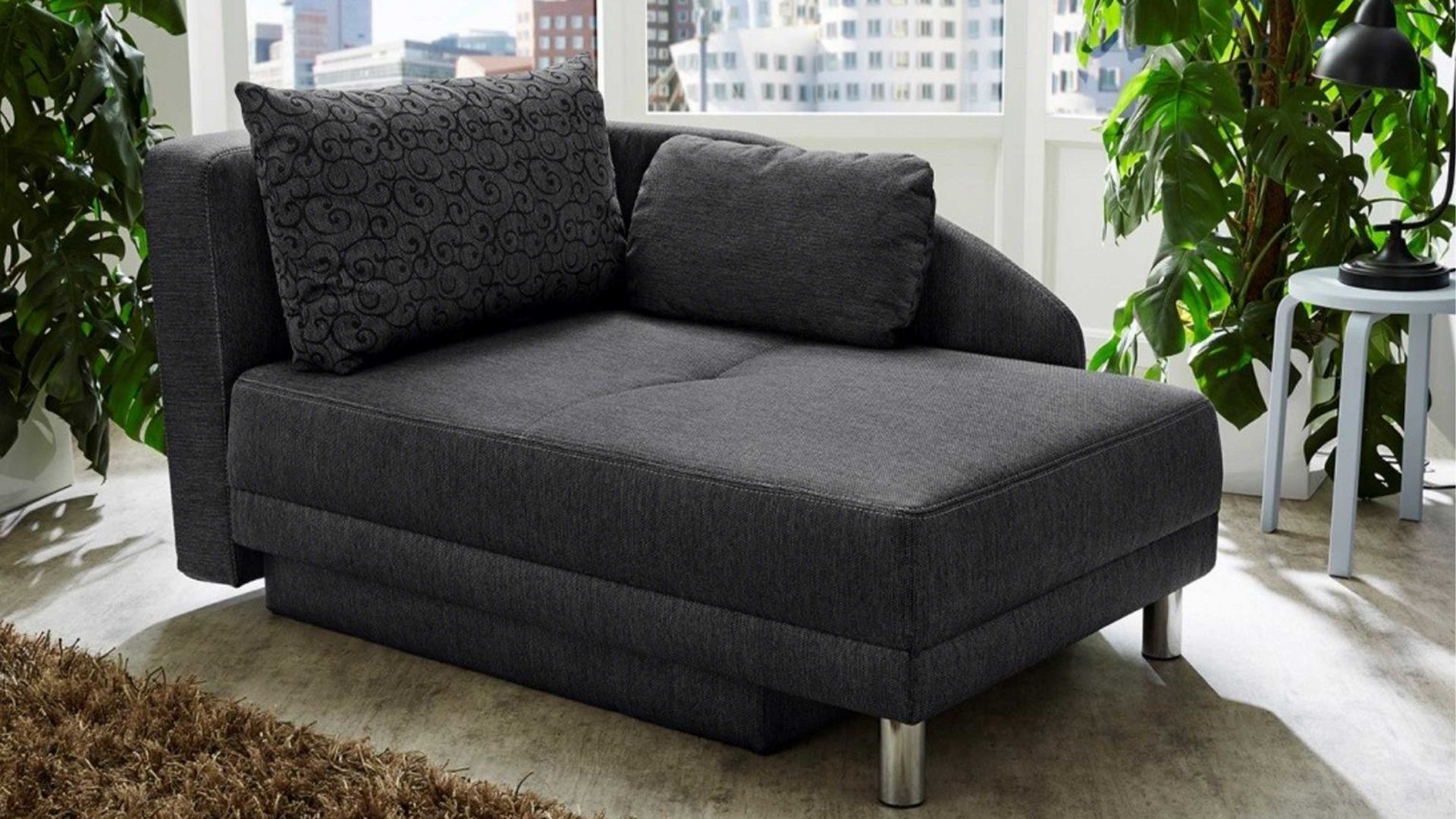 Die Recamiere ist klassisch-elegant designt. Sie weist einen anthrazitfarbenen Flachgewebebezug sowie chromfarbene Füße als stabilisierende Basis auf. Die Farben und Materialien harmonieren vorzüglich miteinander und ergeben in Kombination ein sehr edles Ganzes, das die Blicke auf sich zieht.