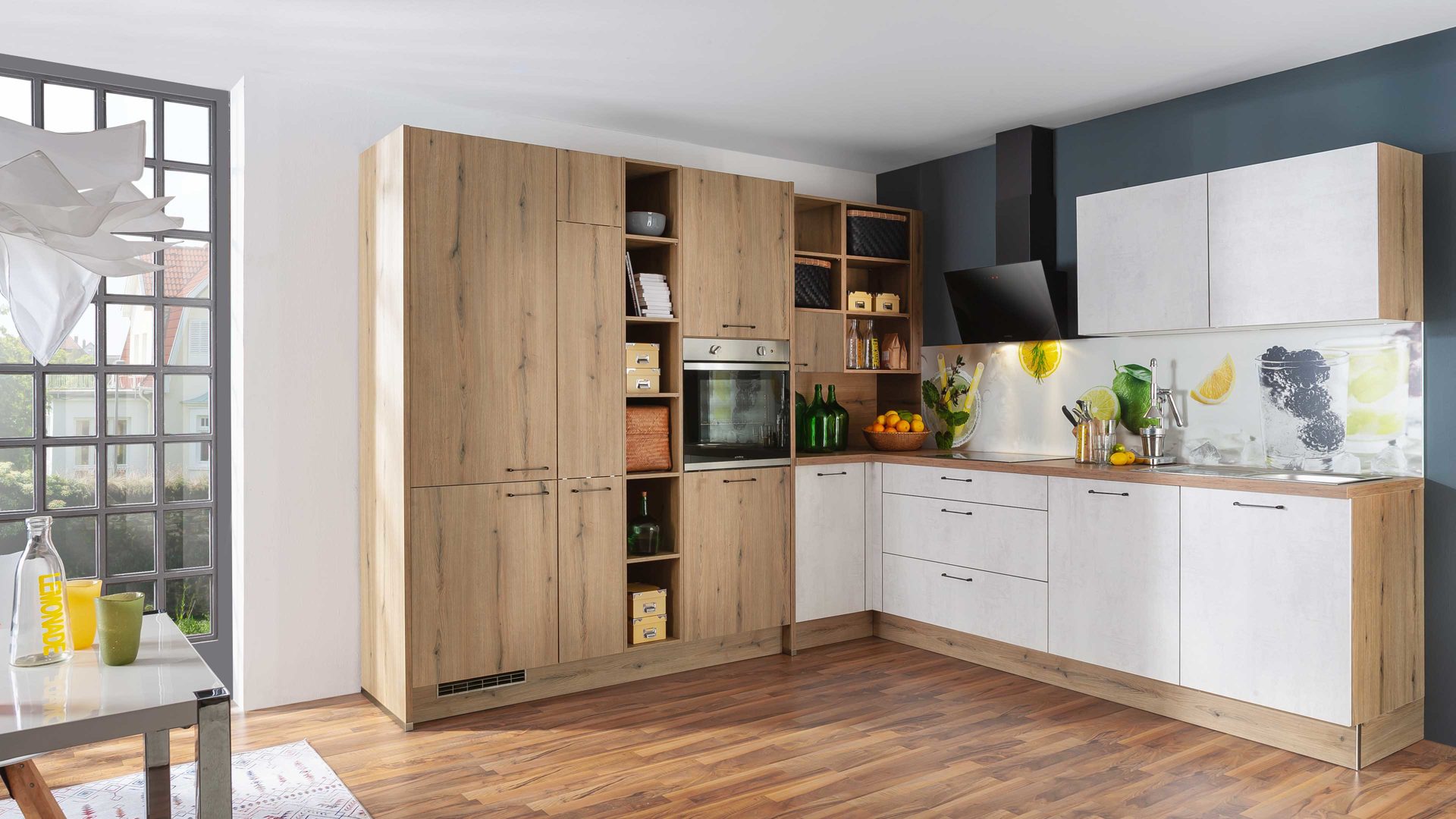 Die EXPRESS KÜCHEN Einbauküche Plan mit privileg Geräten kombiniert den natürlich-warmen Charme astiger Eiche-Nachbildung mit der puristischen Ausstrahlung steinweißer Beton-Nachbildung. Arbeitsplatten, Sichtseiten, Regale und Sockelblenden sind wie der Großteil der Fronten im attraktiven Eiche-Ton gehalten. Mattschwarze Bügelgriffe runden die moderne und elegante Optik der Planküche stilsicher ab.