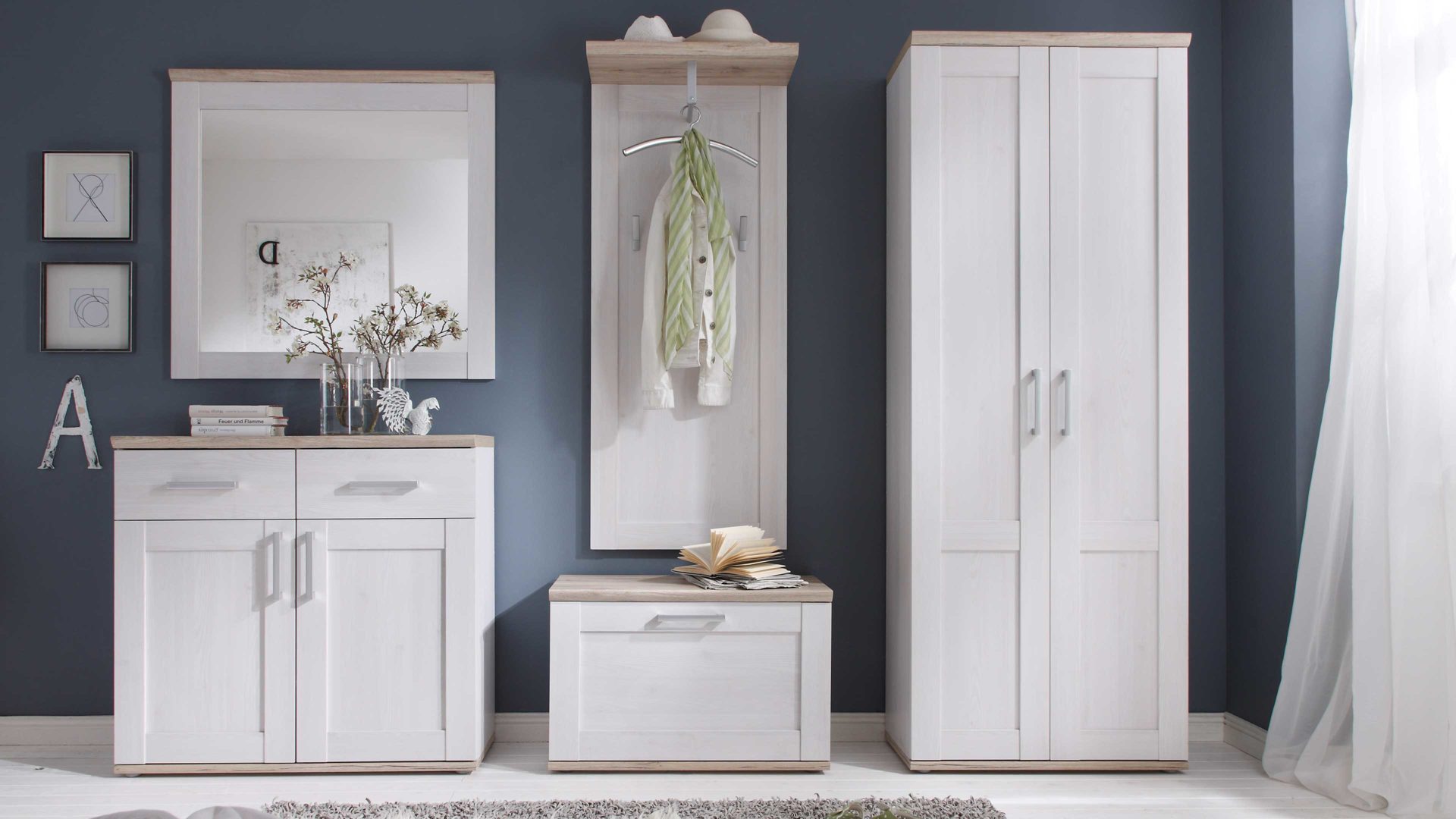 Hinter den zwei Türen der Schuhkommode befindet sich jeweils ein Boden. Überdies verfügt die ca. 96 x 91 x 38 cm (BxHxT) große Kommode über zwei Schubladen für zusätzlichen Stauraum. Die Maße des Wandspiegels belaufen sich auf ca. 96 x 92 x 4 cm (BxHxT). Zur Wandgarderobe gehören zwei Haken und ein Boden mit Kleiderstange. Sie misst ca. 59 x 143 x 30 cm (BxHxT). Die praktische Schuhbank ist mit einer Klapptür ausgestattet, hinter der sich eine Mittelwand und zwei Böden verbergen. Ihre Maße betragen ca. 76 x 50 x 38 cm (BxHxT). Gegen Mehrpreis wird Ihnen die Bank mit einem komfortablen Sitzkissen geliefert. Im Inneren des zweitürigen Garderobenschranks des Dielen-Sets erwarten Sie vier Einlegeböden und eine ausziehbare Kleiderstange. Er ist ca. 76 x 201 x 39 cm (BxHxT) groß.