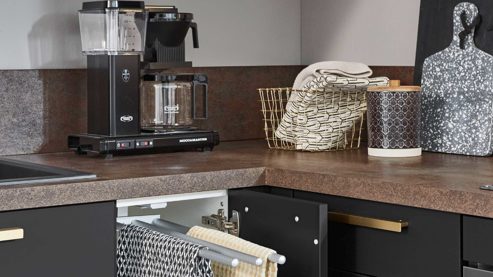 Die nobilia® Winkel-Einbauküche Easytouch setzt mit ultramatten grafitschwarzen Lacklaminatfronten ein klares Designstatement. Goldfarbene Metallgriffe sorgen für einen eleganten Kontrast und verleihen der Küche eine exklusive Note.