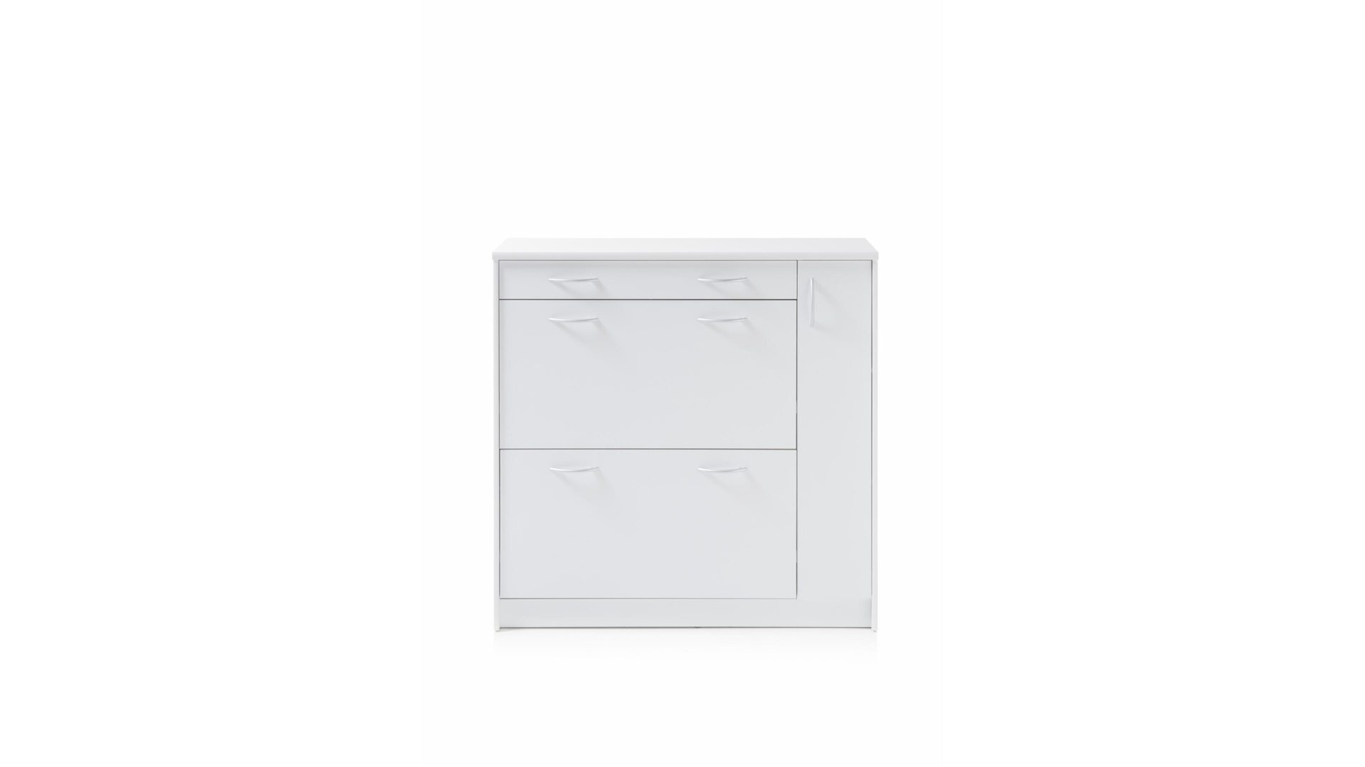 betonfarbene & weiße Kunststoffoberflächen – eine Schublade, zwei Klappen, eine Tür