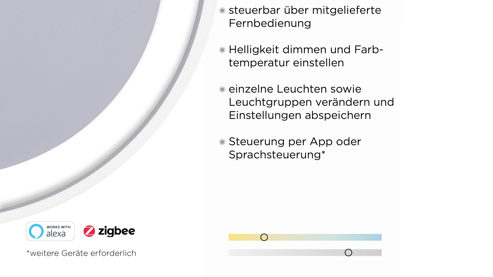 | Verstellbarkeit und Funktion: | dimmbar ZigBee®-fähig Funk-Fernbedienung per App steuerbar Sprachsteuerung Alexafähig Memoryfunktion | |