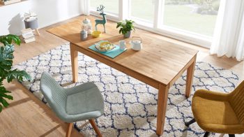 Die parkettverleimte Tischplatte mit Schweizer Kante verleiht dem Tisch eine edle Note und sorgt gleichzeitig für zusätzliche Stabilität. Mit seinem Butterfly-Auszug mit einer Einlegeplatte von ca. 60 cm Länge ist der Tisch ausziehbar und kann so flexibel an Ihre Bedürfnisse angepasst werden.