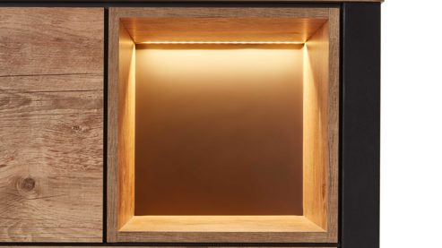 mit einer Klapptür und einem Glasboden, zwei offenen Fächern mit LED-Beleuchtung, zwei Holztüren mit jeweils einem Holzboden und einer Schublade