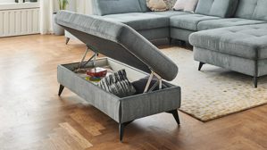 • Die Abbildung zeigt ein Wohnbeispiel, welches auch Zubehör enthält. Im Lieferumfang enthalten ist ein Funktionshocker mit schwarzen Metallfüßen.